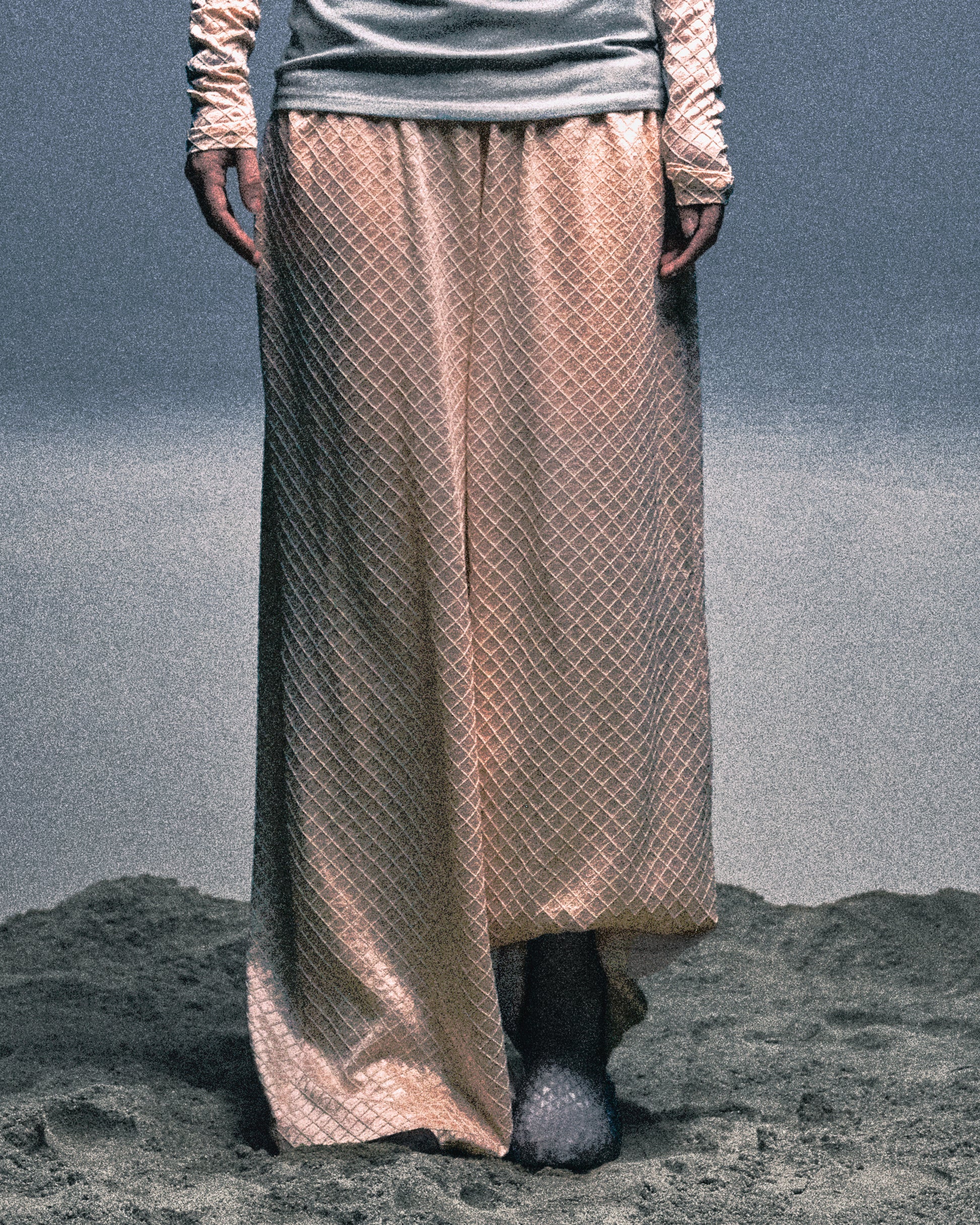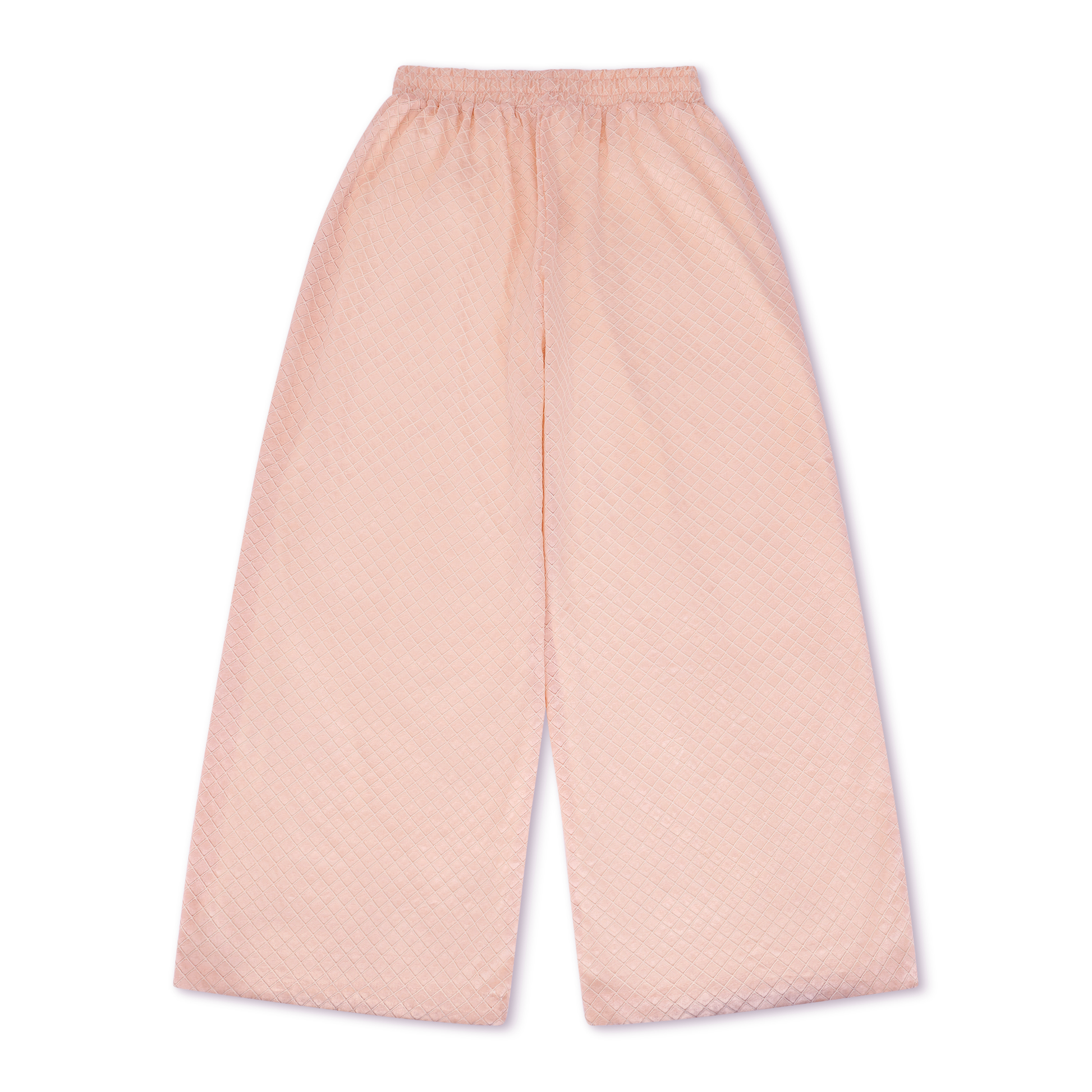Crafted from a baby pink polyester-satin blend and showcasing a thick waffle threaded texture.