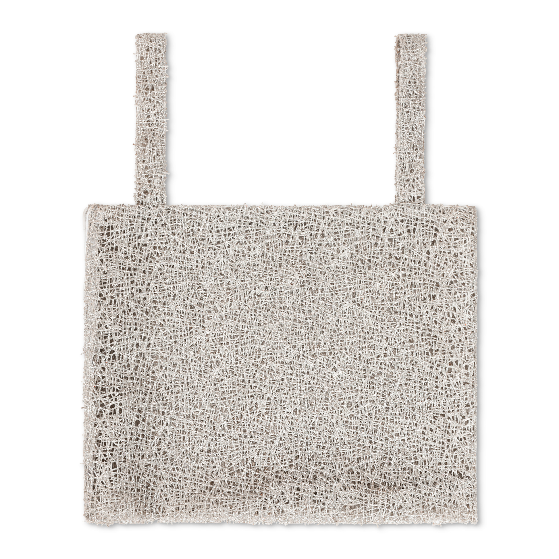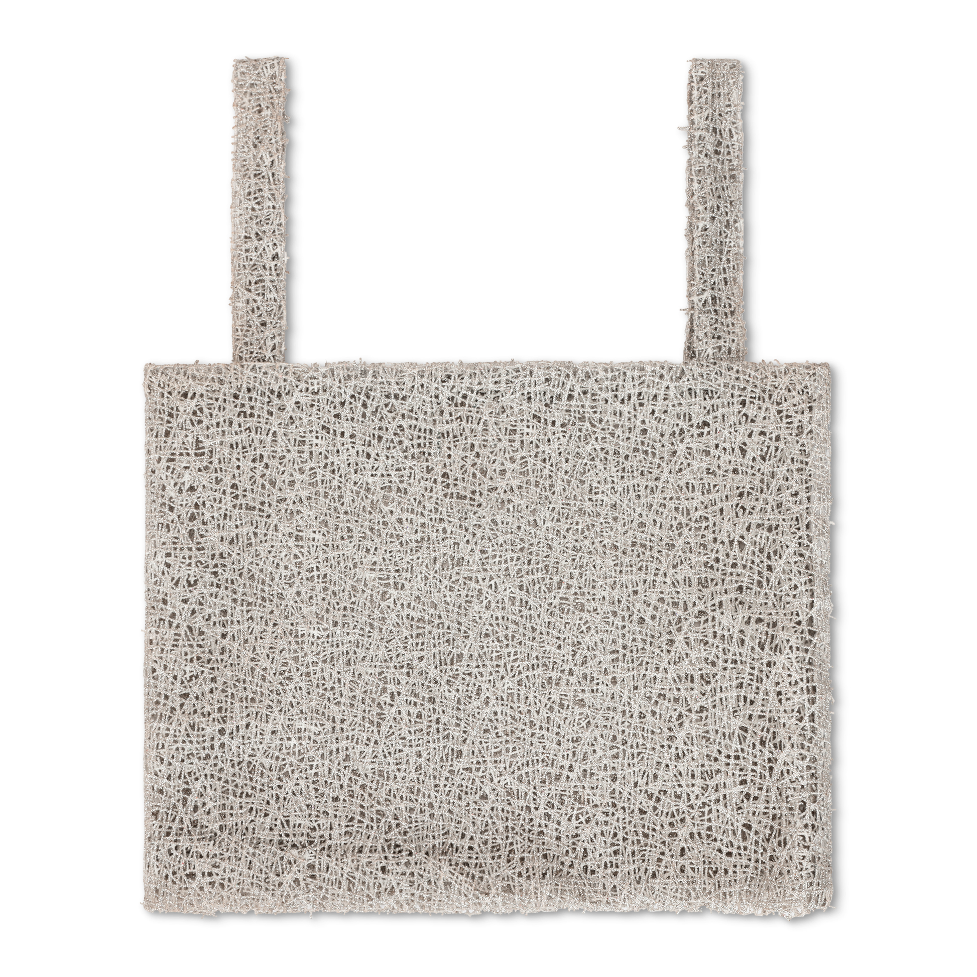 Crafted from a synthetic webbed silver glitter lace.